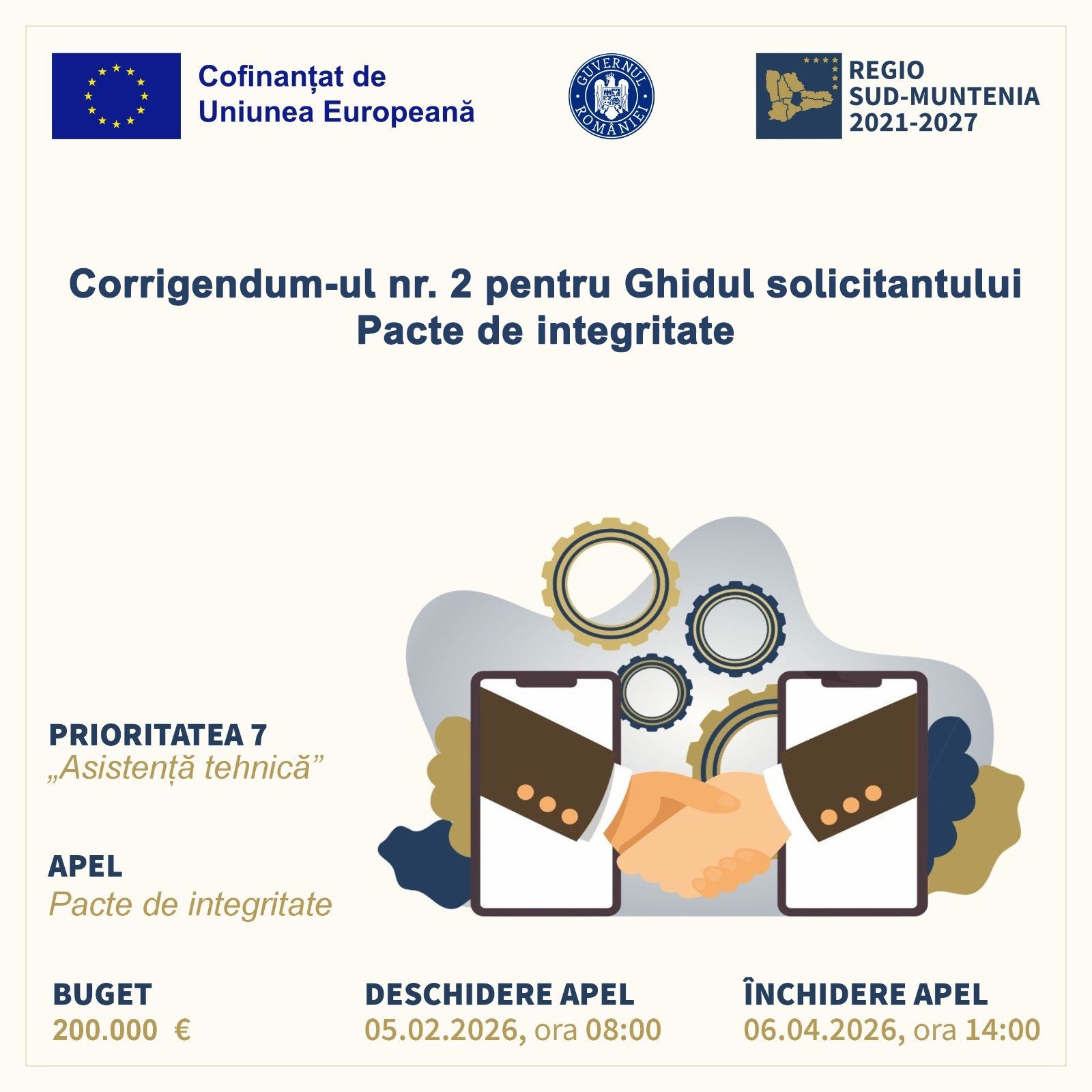 Agenţia pentru Dezvoltare Regională (ADR) Sud-Muntenia, în calitate de Autoritate de Management (AM) pentru Programul Regional (PR) Sud-Muntenia 2021-2027, a emis Corrigendum-ul numărul 2 pentru Ghidului Solicitantului „Pacte de integritate”, aferent Priorității P7 – Asigurarea funcționării sistemului de management al PR Sud-Muntenia, componenta de Asistență tehnică.