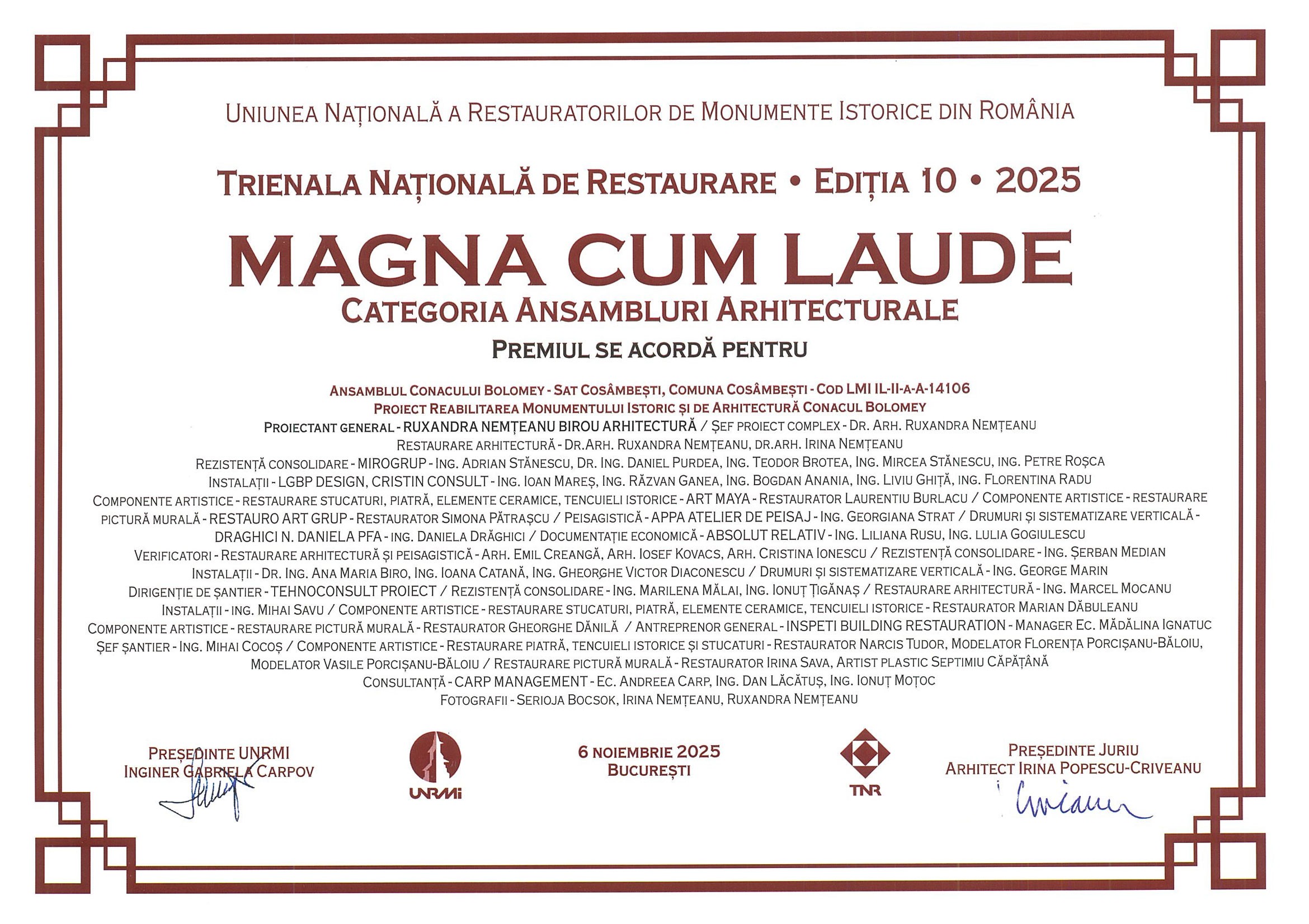 Printre proiectele laureate ale ediției s-a remarcat în mod deosebit Conacul Bolomey din comuna Cosâmbești, județul Ialomița, care a obținut Premiul „Magna cum laude” la categoria „Ansambluri Arhitecturale”, ca recunoaștere a valorii restaurării sale exemplare și a reintegrării funcționale în viața comunității locale.