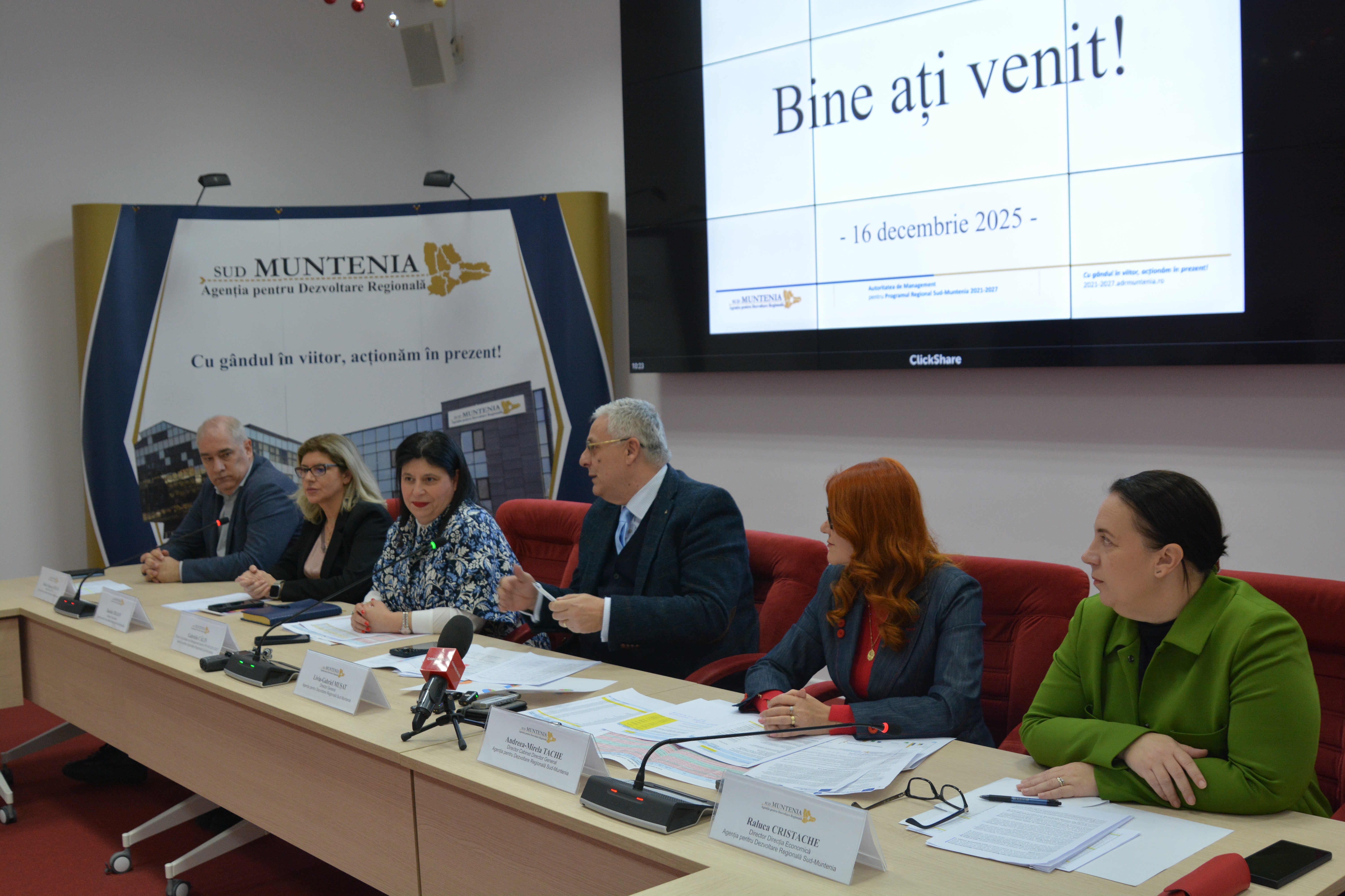Agenția pentru Dezvoltare Regională (ADR) Sud-Muntenia a organizat marți, 16 decembrie, la sediul central, conferința anuală de presă dedicată prezentării rezultatelor activității din anul 2025. Liviu-Gabriel Mușat, directorul general al ADR Sud-Muntenia, alături de echipa de conducere, a prezentat stadiul implementării Programului Regional (PR) Sud-Muntenia 2021-2027, al Programului de Tranziție Justă (PTJ), precum și despre activitățile desfășurate de ADR Sud-Muntenia.